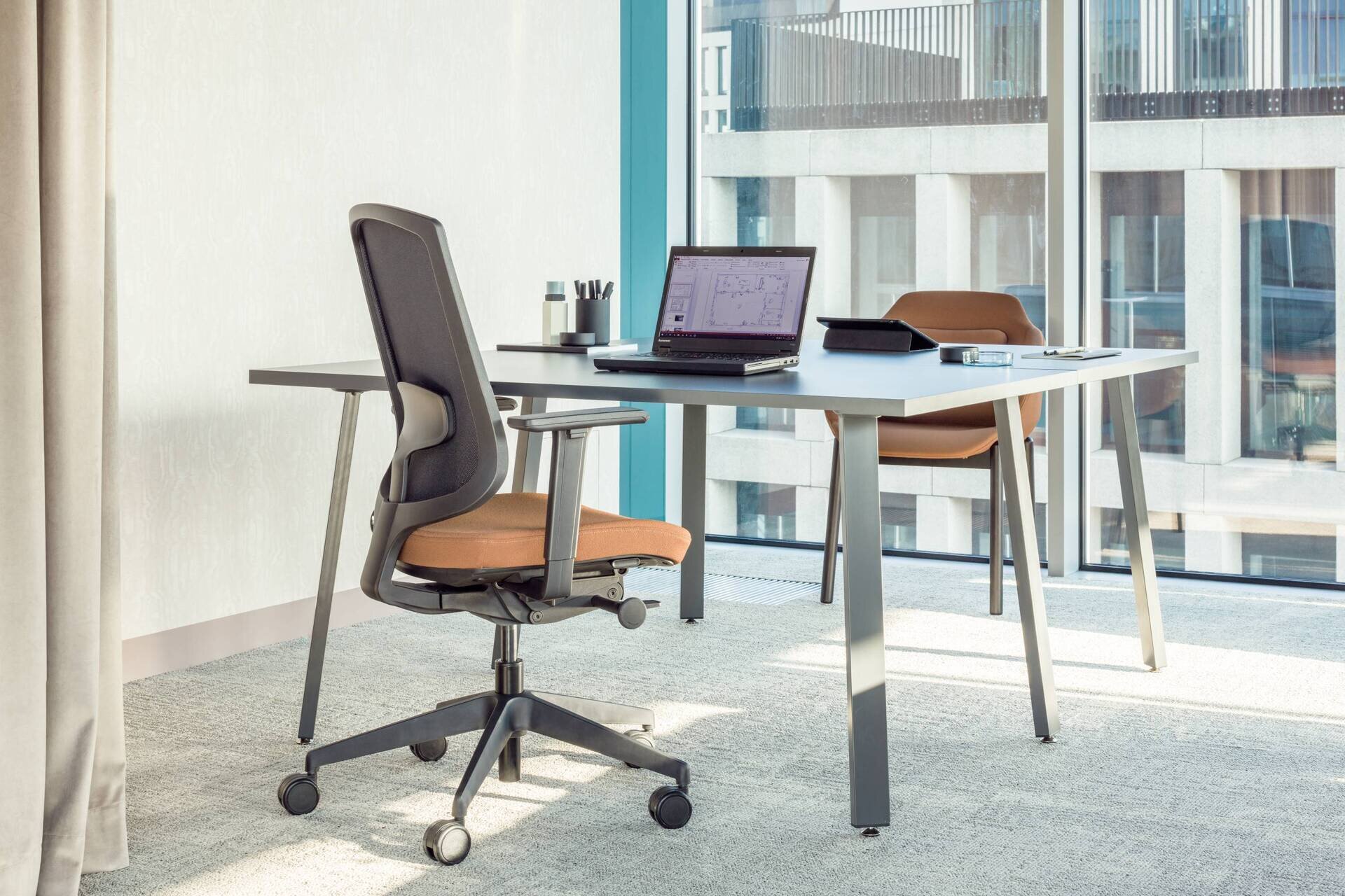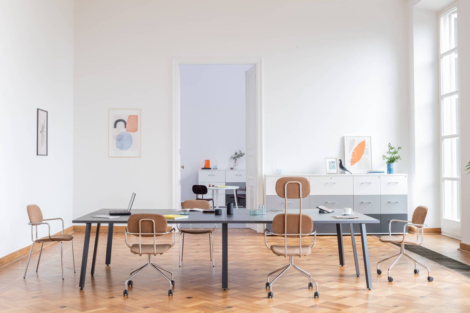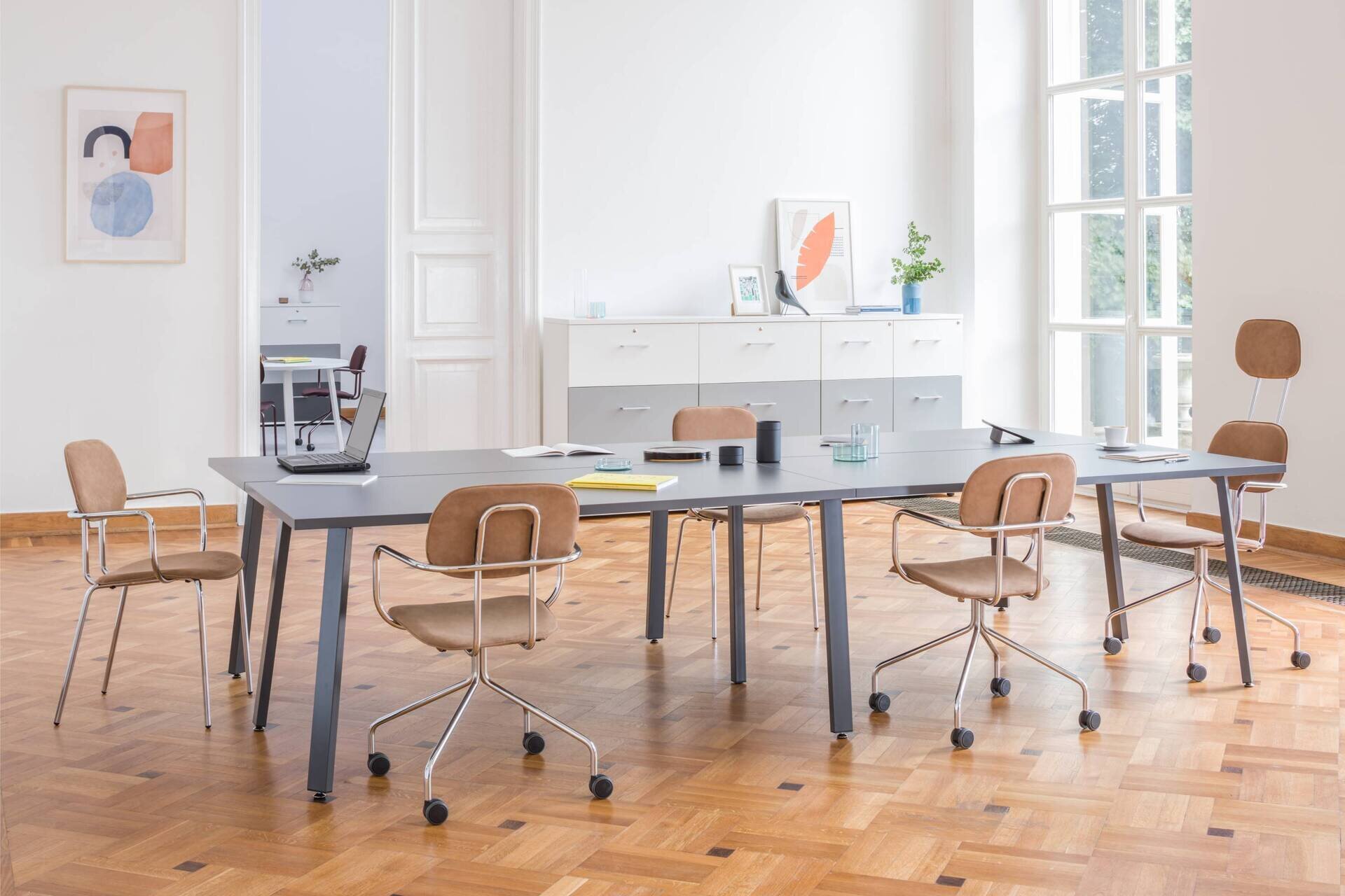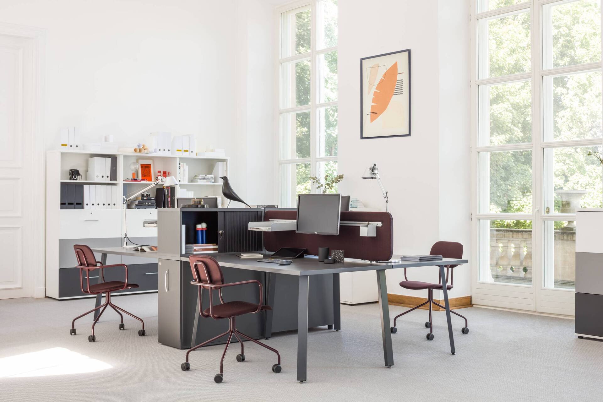 Jednoduchý dizajn ponúka mnoho možností usporiadania pracovného priestoru, čo je ideálne pre zdieľané a otvorené kancelárie. Pracovné priestory je možné oddeliť akustickou zástenou, dostupnou v rôznych farbách a látkach, čo vytvorí pocit súkromia na pracovisku. Pracovný priestor je možné rozšíriť použitím podstavcov a skriniek pod stôl.